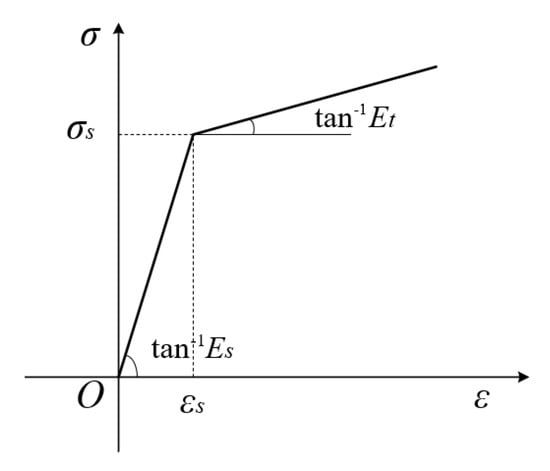 The density of the Q345 steel is 7850 kg/m3, the elastic modulus is Es = 2.06 × 105 N/mm2 and the yield stress is fy = 345 N/mm2. The ideal linear hardening elastoplastic model, plotted in Figure 2, is selected for its constitutive relationship, where the tangent modulus of the hardening stage is Et = 0.01 Es.
