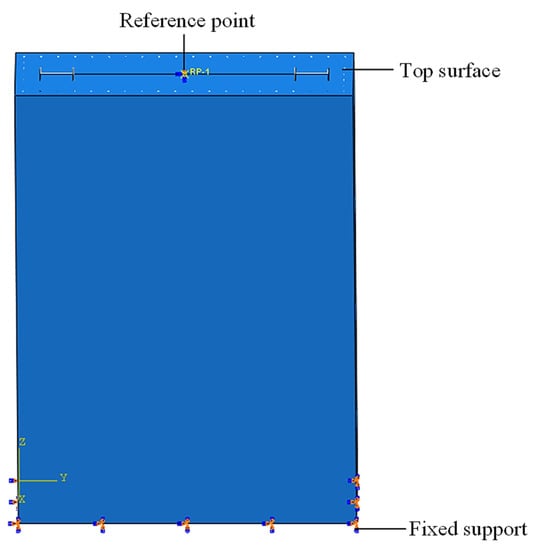 According to the existing relevant tests [], during the test loading process, the stiffness of the loading beam at the top of the shear wall and the foundation beam at the bottom is relatively large and is not within the scope of analysis. To simplify the model and improve the analysis speed, no loading beam is set at the top of the model. As shown in Figure 3, a reference point is set at the center of the upper part of the shear wall and coupled with the top surface. The boundary condition U1 = UR2 = UR3 = 0 is applied at the reference point; that is, the displacement of the top along the X-direction and the rotation angles in the Y- and Z-directions are constrained, and the vertical concentrated force load and lateral cyclic load are added. The bottom of the shear wall is completely fixed.