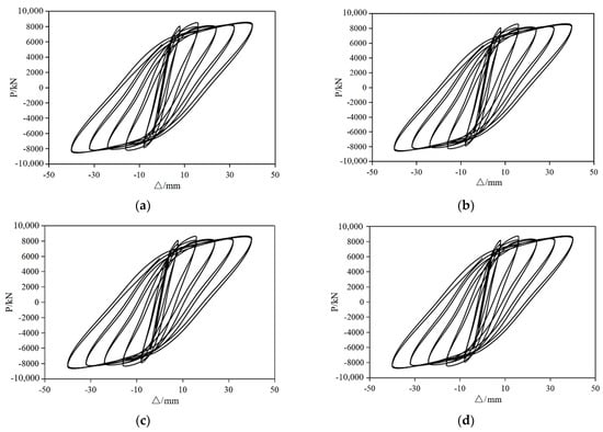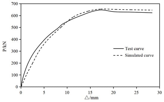 The skeleton curve of the model is compared with the peak horizontal displacement–load curve obtained by finite element simulation, as shown in Figure 4. It can be seen that the load–displacement curve of the simulation results is almost consistent with the test results, and their initial stiffness, ultimate axial compression-bearing capacity and yield point displacement are close. However, after reaching the peak point, the descending curve amplitude of the finite element model is smaller than that of the test, which is due to the fact that the finite element model is too ideal to fully simulate the material properties of concrete after cracking failure. In general, the simulation results are in good agreement with the test results to a certain extent, and the simulation results are reliable.