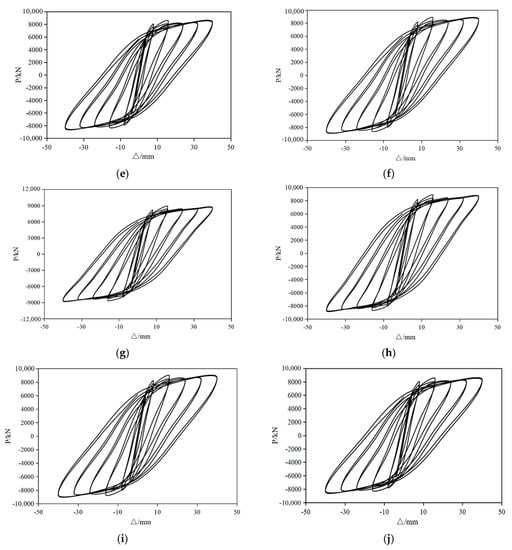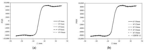 Hysteresis curve of models with different fishplate thicknesses. (a) tf = 4 mm; (b) tf = 5 mm; (c) tf = 6 mm; (d) tf = 8 mm; (e) tf = 10 mm; (f) tf = 12 mm; (g) tf = 14 mm; (h) tf = 16 mm; (i) tf = 18 mm; (j) GBSW-12.