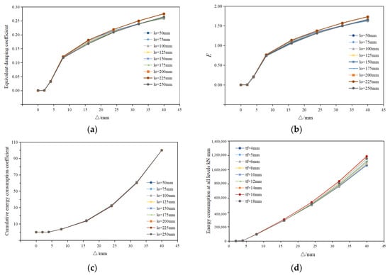 Correlation curve of the energy dissipation capacity of models with different fishplate thicknesses. (a) Equivalent damping coefficient; (b) energy dissipation coefficient; (c) cumulative energy dissipation coefficient; (d) energy dissipation at each stage.