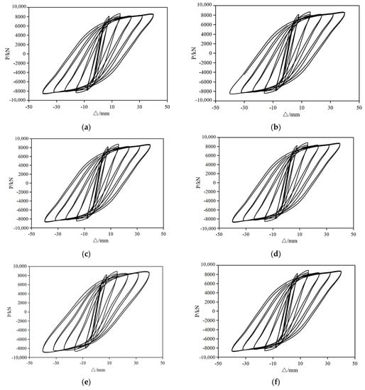 In this paper, the applied vertical load is mainly determined by the axial compression ratio of the shear walls. The loading method is referred to in reference [], declaring that the displacement is used to control the loading. First, by studying the stress condition of the shear wall under monotonic loading, the yield displacement is calculated to be about 8 mm according to the obtained load–displacement curve. Hence, the loading displacement, Δy, of each model is set to be 8 mm to facilitate the comparison between the two types of shear wall models. The displacement is applied according to 2 mm, −2 mm, 4 mm, −4 mm, 8 mm, −8 mm, 16 mm, −16 mm, …, −40 mm for loading. Before the displacement is 16 mm, each stage is loaded once, and each stage is loaded twice after 16 mm.