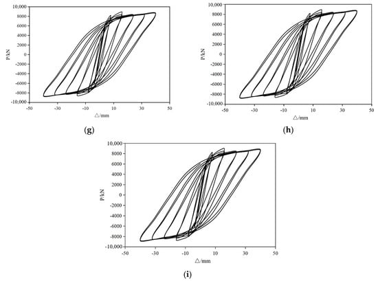 Hysteresis curve of models with different lap lengths. (a) lo = 50 mm; (b) lo = 75 mm; (c) lo = 100 mm; (d) lo = 125 mm; (e) lo = 150 mm; (f) lo = 175 mm; (g) lo = 200 mm; (h) lo = 225 mm; (i) lo = 250 mm.