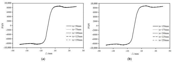 In order to consider the effect of the length of the lap part of the fishplate and the embedded steel plate on the performance of the SPCSW with a fishplate connection, the lap lengths, lo, are changed to 50 mm, 75 mm, 100 mm, 125 mm, 150 mm, 175 mm, 200 mm, 225 mm and 250 mm. Model size; shear–span ratio, λ; axial compression ratio, n; fishplate thickness, tf; and other parameters remain unchanged, as shown in Table 8.
