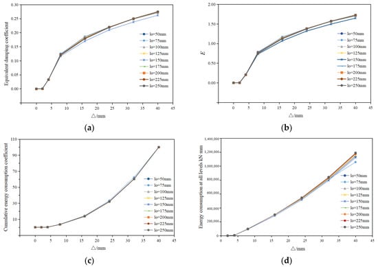 Correlation curve of the energy dissipation capacity of models with different lap lengths. (a) Equivalent damping coefficient; (b) energy dissipation coefficient; (c) cumulative energy dissipation coefficient; (d) energy dissipation at each stage.