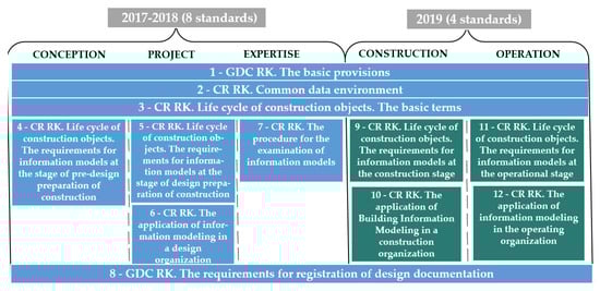 ‘Kazakh Scientific Research and Design Institute of Construction and Architecture’ (KazSRICA) joint-stock company (JSC), which first initiated the adoption of BIM in Kazakhstan in 2015, developed 12 regulatory documents on BIM in Kazakhstan after the publication of the action plan in 2017 (Figure 1). These 12 regulatory documents define principles and requirements for the information management process, including the creation of an information model, its use, as well as the conditions for the exchange and storage of data, among others. It gives information for all stakeholders in the development and implementation of investment projects for the construction of facilities using BIM technology at the expense of public investment in construction and funds of subjects of the quasi-public sector. KazSRICA JSC also leads the Commission for the development of scientific and technical documentation in the field of information modeling under the Basic Organization of the Commonwealth of Independent States (CIS) member states.