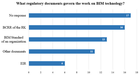 Most of the respondents did not answer the question; some respondents specified that they do not use any: sixteen companies out of fifty-eight use the BCCRs of the RK. Six companies follow Exchange/Employer Information Requirements (EIRs). As this question was an open text question, multiple responses were collected. The section of “other” companies and organizations highlighted the use of Publicly Available Specifications (PASs) such as PAS 1192 2 2013, PAS 1192 3 2014, UK BIM Protocol Version 2, BS 1192, and Euro codes. It was noted by companies that the current regulatory framework does not correspond to the desired quality.