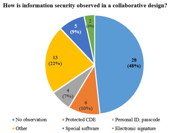 How information security is observed in a collaborative design was an open-text question. Collected similar answers were grouped into the following categories, as shown in Figure 7. It was found that almost half of companies and organizations do not have an observation of information security during collaborative design. If the question was skipped, it was regarded as “No observation”. One-tenth of the respondents specified the use of protected common data environments (CDEs), while nine percent indicated the use of special software. The use of personal identification with a passcode and electronic signature took the lowest share, at seven percent and four percent, respectively.
