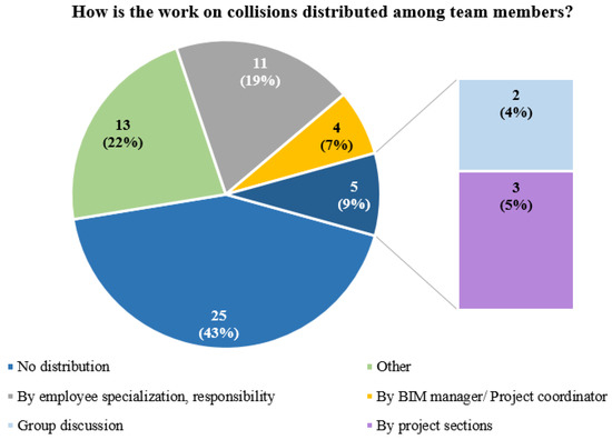 Distribution based on the volume of the work, schedule, workload of employees, choice of employees, intermediate control, collision type, and company standards, along with agile methodology, was recorded in “Other”. One company noted that the distribution varies from the designed object as well as daily, while another company highlighted that the distribution is achieved through email and verbal communication. It can be seen in Figure 8 that construction companies and design organizations do not have a similar pattern to follow and have difficulties in distributing work with clashes. Nevertheless, the success of the project highly depends on the proper allocation of the work.