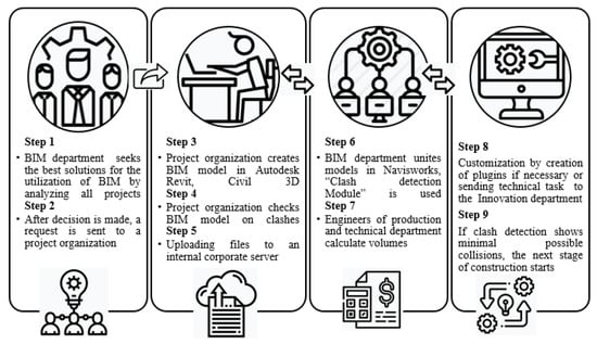 As this research focuses on managing work within BIM departments, it was crucial to identify the existence and functionalities of BIM departments. However, this research did not focus on project implementation methods in company practices. As noted in the research done by Akhanova and Nadeem [10], the integrated project delivery method is not the practice of the AECO sector in Kazakhstan. Most of the time, construction companies use design–bid–build and design–build methods [10]. The online survey showed that more than half of companies and organizations have BIM departments. However, the number of employees in departments where BIM technology is used is less than ten, which demands a fast response of Kazakhstan’s AECO industry to the adoption of this modern technology.