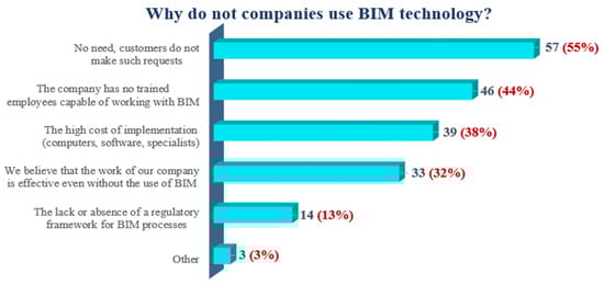The reasons for refusing to implement BIM among the companies surveyed. (Adapted with permission from ref. [12]. Copyright 2020 National Association of Designers of the Republic of Kazakhstan).