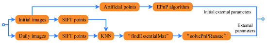 To obtain the external parameters, an OpenCV-based program is introduced, which can be used to infer camera external parameters through feature points between images [63]. As shown in Figure 3, the program consists of the following steps: