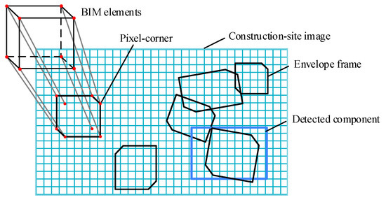 First, it is necessary to calculate the position of BIM elements in each image plane. In this study, the coordinates of each corner of BIM element are extracted manually at once. Through the transformation of the projection model, the coordinates of the corners of BIM elements in the plane can be obtained. As show in Figure 4, each corner of the component corresponds to a pixel point, which is named as ‘pixel-corner’. Then, the exterior pixel-corners are connected to form a convex polygon, named ‘envelope frame’, so that all the pixel-corners are wrapped in the envelope frame and the component location can be represented by these pixel-corners on the envelope frame.