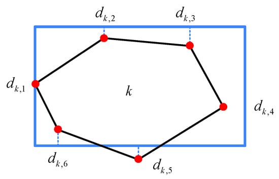 Then, for each detected component, it is compared with the BIM projection areas. The comparison method is shown in Figure 5. The outer rectangular box is a location frame generated by target detection, and the inner polygon is an envelope frame generated by a BIM element projection, which is a convex polygon composed of six pixel-corners. For each rectangular frame, the mean-square error between it and the envelope frame k could be calculated by: