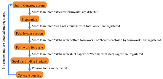 In this study, the sequential relationship of different components is used as supplementary information for auxiliary reasoning. For example, when the bottom formworks of slabs are detected and registered, it can be considered that the steel bar binding and formwork supporting work of facades have been finished. Figure 7 shows the conditions under which construction can be judged to have entered a new stage. To avoid accidental errors, the threshold of stage update is set to three. After the concrete pouring, building components cannot be identified, and the construction progress would be judged to enter a new floor.