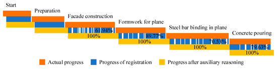 After the registration, the BIM elements corresponding to the target recognition results are obtained, however they are not the schedule. It is necessary to further infer the construction progress with auxiliary information. In addition, due to the widespread occlusion in a construction site, many components are not recognized and registered. Therefore, through auxiliary reasoning, the influence of occlusion can be avoided as much as possible to obtain the actual progress.