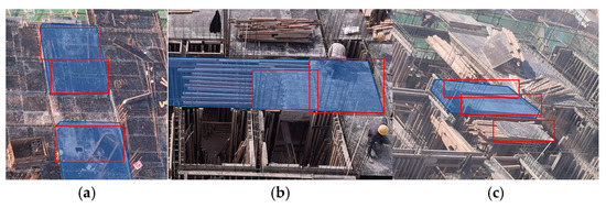 Based on the analysis of the construction-site environment, it is obvious that a component shows various forms in different periods, and it is unrealistic to recognize all states of all components from the image due to occlusion. Therefore, in this study, only a few types of components are labeled and identified to infer the construction progress. The identified objects include stacked formwork, walls or columns with formwork, beams enclosed by formwork, beams with steel cages, slabs with bottom formwork, slabs with steel cages, and pouring tools. The training set is annotated by the graphic image annotation tool LabelImg [58], generating XML files in PASCAL VOC format.