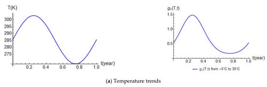 In [35] a periodic function is used where the trend represents the season weather, e.g., one year (t = 1 year) corresponds to one cycle with two peaks: positive (hot and dry summer) and negative (cold and wet winter). Equations (16) and (17) represent these conditions as shown in Figure 4 for the values given in Section 4.1. Therefore, the form of Equations (16) and (17) have been defined a posteriori.
