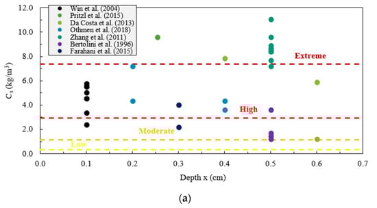 All phases encompass all factors modifying the chloride ingress in the convection area. A physical condition to obtain Equation (3) is that Cs must be uniform and constant in t and x and the external surface of the concrete must be plane [22,57]. This condition could be applied when the effects of the environment variations are negligible and there is no frequent washing for example by rain [40]. However, Cs depends on environmental conditions, topography, the orientation of the concrete surface, and distance from the coastline [1]. In [26] it is also shown that Cs depends on the chloride binding capacity of the concrete and its porosity at the surface, whereas in [4] Cs have correlated to the wind dynamic actions. In this sense, Cs in real conditions are not constant in time t.