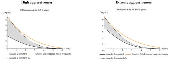 To the best of the authors’ knowledge, there are no similar models that account uniquely for the concrete irregularity and the increment of Cs. Therefore, it was difficult to compare our model with other studies. However, the following aspects were conducted to validate it: (i) the use of consolidated inputs adopted in several published studies (see Table 1 and Table 3); (ii) the use of numerical analyses already calibrated in previous studies, e.g., [39,43]; (iii) the collection of data from reliable published studies (see Figure 6 and Table 2); and (iv) the comparison of the error function based solutions with the new numerical results in this paper.
