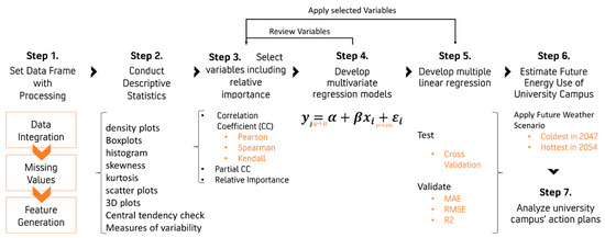 In this study, the hourly energy consumption data were obtained, which consist of ELC and STM. To answer the research questions, the BEMs’ development process follows six-steps, namely: (1) set data frame with processing, (2) conduct descriptive statistical analysis, (3) select variables including relative importance analysis, (4) develop multivariate regression models, (5) develop multiple linear regression (MLR) models, (6) estimate energy use of a university campus with future weather data, and (7) analyze university campus’ action plans (
