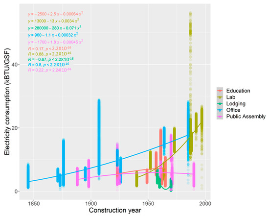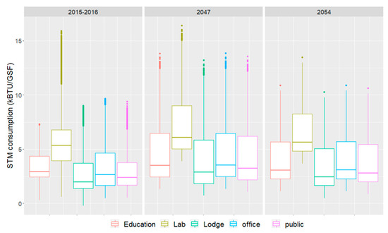 To be specific, energy consumption patterns by building type are analyzed as follows: through descriptive statistical analysis, the rapid increase of ELC consumption in the laboratory and the office was observed. One of them may be the increasing demand of computing work in laboratory and office buildings, because this trend is not present in lodging, education, and public assembly. Laboratories are the most energy consuming building type. The laboratory building type has a larger variance in STM consumption compared to other building types, and the laboratory requires much higher STM consumption, as a regression model shows (