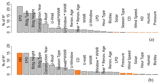 37]. Unlike Bruan et al.’s study, temperature was insignificant for ELC, while solar radiation was the most critical weather factor for ELC among meteorological variables. The end use needs to be compared for the appropriate comparison. Based on analyzing the relative importance of MLR models, the most effective key variables to answer for RQ1 about the appropriate building- and weather-related variables to be included in the predictive model are as follows: EPD, building type, building height, and construction year for ELC and HD, EPD, building height, and building type for STM.