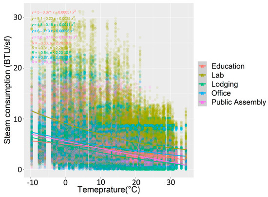 35]. Therefore, the university needs to track the cause of energy consumption and replace it with energy efficient equipment (better EPD) or improve the insulation of building components for laboratory buildings. According to the regression model with temperature and STM consumption, laboratory buildings had the steepest slope, and office buildings had the second steepest slope. The steep slope means that more STM is consumed when the temperature is higher. Evaluating laboratory hoods is suggested to universities to improve energy efficiency, user operations, or to arrange for removing unneeded equipment [