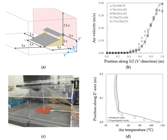 The dimensions of the model and the computational domain are 0.36 m (X+) × 0.268 m (Y+) × 0.189 m (Z+) and 1.08 m × 1.07 m × 0.567 m, respectively. In simulations, the floor is an adiabatic plate with no-slip condition, and the other boundary conditions of the computational domain are Neumann conditions. Although the geometry of the experimental model (Figure 3c; 1/50 scale of Figure 1c) and that of the physical model in the present study (Figure 2b) are not identical, there is a sufficient amount of similarity to consider this validation approach: both models are isolated, same pitched roof configurations, both have similar boundary conditions and both are subjected to thermally buoyant force. As a result, the essential thermal and airflow features in the validation works will also be present in the physical model.