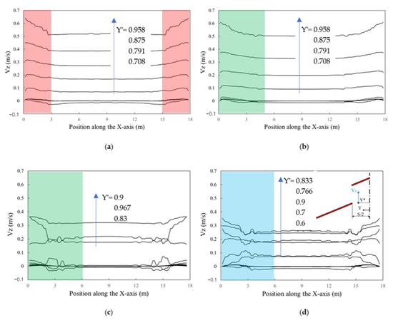 Figure 5 shows the change in the outward air velocity (Vz) at a horizontal exit of the ridge vent (❽ in Figure 2b) along the long axis of the workshop (X-axis). Y* is the dimensionless distance between the observation point and the central axis of symmetry (=Y/(S/2)) (Figure 5d). As shown in these figures, Vz significantly changes on both sides of the building (both the left and right sides of each figure), which are called edge effects. The influence range varies with the design parameters. As shown in Figure 5a, when S = 1.2 m, H = 0.3 m, and E = 0 m, there are edge effects within approximately 3 m of both sides of the building, as shown in the red zone; when E and S increase to 0.6 m and 3 m, as shown in the green zone in Figure 5b,c, the influence range of the edge effect expands accordingly. When H increases to 1.2 m, the blue zone in Figure 5d shows that Vz exhibits a more significant change along the X-axis. When S = 1.2 m (Figure 5a,b), the value of Vz increases with increasing Y*; that is, Vz increases toward the edge of the horizontal opening of the ridge vent (i.e., approaching the lower roof panel). However, when S = 3 m (Figure 5c,d), the value of Vz does not increase with increasing Y*. According to Figure 5c, the overall value of is 2.83 m3/s. The ventilation rates in the edge effect zones on both sides are both 0.98 m3/s, the sum of which accounts for approximately 70% of . The ventilation rate in the unit length along the X-axis within the edge effect zone is 0.163 (m3/s)/m, while that within the nonedge effect zone is 0.144 (m3/s)/m; the differences between the two are not significant.
