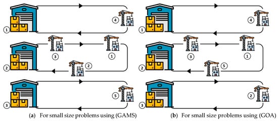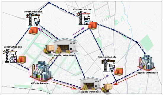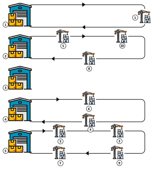 One of the most significant elements of a supply chain of an off-site construction system is the transportation mode. Various types of vehicles with different capacities affect freight costs and help managers make more appropriate decisions according to the lead times and the types of available vehicles [,]. Moreover, a network of roads enables interconnection between different locations, so choosing the most suitable route according to the arrival time is considered fundamental to the practice. In this regard, the integration of inventory and transportation decisions, which optimises the ordering and delivery policies, was represented by Zhao et al. []. The first research, which focused on a transportation–location–routing problem, was investigated by Martínez-Salazar et al. []. This paper integrated decisions about the number of vehicles with limited capacity with the location routing problem. Furthermore, there are studies about transportation–inventory problems (TIP) []. For instance, Lee et al. [] developed a TIP model, and unlike traditional models, the number of buyers and the number of intermediate stops may change in each period.