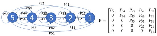 Equation (3) is known as the Chapman–Kolmogorov equation. Solving Equation (3), the transition matrix (P) is given by the following expression:
