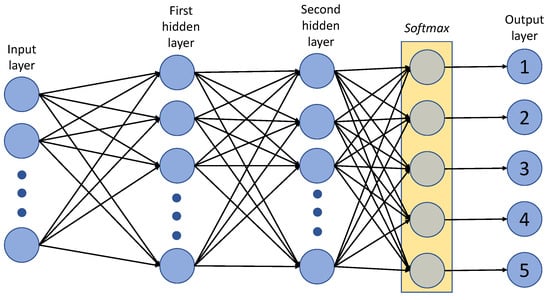 Multilayer perceptron with two hidden layers and softmax activation function.