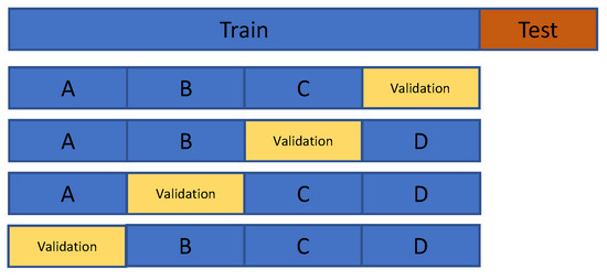 With the statistical test defined, the next step is to distinguish between the model’s performance on the training data and unseen test data. The common practice to avoid the model’s overfitting is to divide the dataset into a training set (80%) and a test set (20%). Subsequently, a stratified k-fold cross-validation technique is performed using the training dataset (Figure 3), preserving the percentage of samples for each CI. The resampling method uses different portions of the data (A, B, C, and D) to train and validate a model on different iterations. The cross-validation gives an idea of how the model might perform in the worst-case and best-case scenarios when applied to new data []. To summarize the models’ cross-validation accuracy, the mean () and standard deviation () are computed.