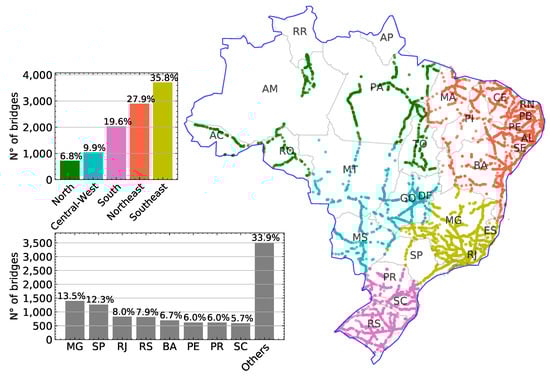 The geographic coordinates of each bridge were exported to a Geographic Information System application []. Figure 4 shows the distribution of bridges, considering Brazilian geography, regions, and states. This figure clearly shows that most bridges (64%) are located in the southeast and northeast regions. According to the inventory collected, the states with highest number of bridges (above 500) are the states of Minas Gerais (MG), São Paulo (SP), Rio de Janeiro (RJ), Rio Grande do Sul (RS), Bahia (BA), Pernambuco (PE), Paraíba (PR), and Santa Catarina (SC). The states of MG (13.5%) and SP (12.3%) contain 26% of the Brazilian bridges.