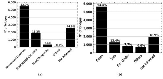 Some key categories were analyzed and presented to understand the available data about the bridges. Regarding the material type, Figure 5a shows the number of bridges built per each category. It is possible to notice that the highest number of bridges are Reinforced concrete (RC), followed by Prestressed concrete (PC), amounting to about 71% of the total bridge inventory. As only some bridges are constructed by other materials (such as wood and masonry), they were clustered in one group (others). It is essential to observe that around 25% of the bridges do not have a material classification available in the database. Bridges’ type represents the structural system of the bridge. As shown in Figure 5b, beam (54.4%) has the highest number among all bridges’ types and slabs are the second (12.4%). As just a few bridges have a different structural system (such as arch bridge, cable-stayed bridge, suspension bridge, and truss bridge), they were clustered in one group (others). This work did not consider the number of spans, length of the largest span, static scheme, or skew angle, among others parameters, due to the scarcity of these data.