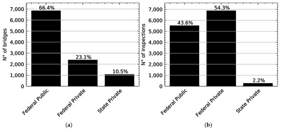 The jurisdiction defines whether the bridge is managed by the federal, state, or municipal government. Figure 6a presents the number of bridges per different jurisdiction. The inventory shows that the federal administration is responsible for the most significant percentage of bridges (89.5%), followed by state administration (10.5%). Additionally, federal, state, and municipal administrations are subdivided into public and private concessions. Figure 6a shows that most bridges (66%) are under public concession. Even though the number of Federal public bridges in Figure 6a is way higher, the number of inspections of Federal private bridges (Figure 6b) overcomes the Federal public one. Considering inspections should happen once a year [], it is expected that the total number of inspections would be proportional to the number of bridges and their ages, but this is not observed, showing that private concession seems to maintain the inspection schedule more strictly.