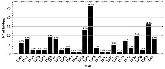 Figure 7 shows the distributions of the number of bridges per year of construction. It is observed that 63% of Brazilian bridges are over 50 years of age. It also manifests the periods of most significant and minor investment in the bridge construction sector, highlighting the positive impact of the Maurício Joppert Law (1945), the period of President Juscelino Kubitscheck (1956 to 1960), the revolutionary period started in 1964, in particular the construction of the Rio-Niterói Bridge (1974), the negative impact of the 1988 Constitution that radically altered the financing sector, and the resumption of investment during the period of President Fernando Henrique Cardoso (1994 to 2002) []. Additionally, the ages of the bridges allow estimating the live load. For example, concerning the standard traffic load model, most bridges designed between 1960 and 1975 considered a TB-36 on roads: a vehicle with 360 kN force []. The bridges designed after 1985, with the new version of the Brazilian standard [], started to consider vehicles with 450 kN force (TB-45) as standard traffic load model. The high number of bridges for which the year of construction is unknown (or was not informed) is just one example of the difficulties found for a more detailed analysis of the existing situation and evidence of missing record information.
