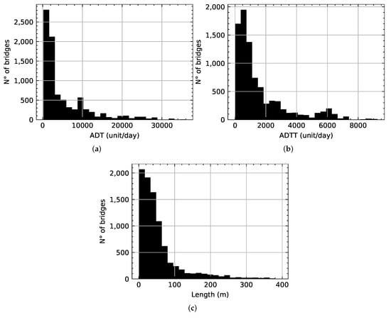 Distribution of bridges according to (a) ADT, (b) ADTT, and (c) total length.