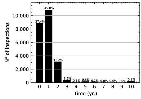 Visual inspections constitute the main form of evaluation of bridges in Brazil, and the records of these inspections are used to assist in the construction and history of the bridge inventory. The first inspections presented in the inventory date back to 2008, covering approximately 13 years and resulting in 24,127 inspections. Figure 9 shows the periodicity of inspections carried out in the period mentioned above. The time between inspections that equals 0 means that only one inspection is available for the bridge. As can be concluded, visual inspections are carried out mostly annually, according to what was discussed in Figure 2.
