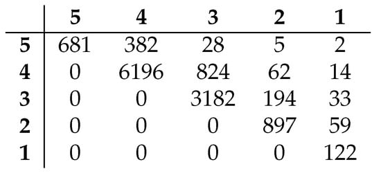 Cross-entropy can overcome this problem by measuring the dissimilarity between the sample data and the model. The cross-entropy evaluates the model on a test set to assess how accurate (based on the computation of likelihood) the model is in predicting the test data by calculating the “uncertainty” (or “information”) of possible outcomes []. The entropy (H) is the expected value of “information” and is evaluated using the following Equation (8):