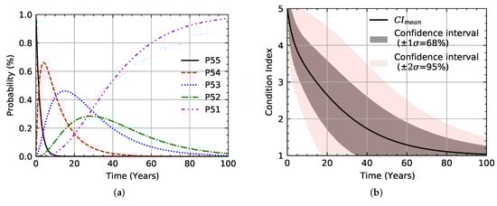 Figure 11a shows the probability of a bridge to be in a determined CI over time. It is possible to observe that the probability of a bridge remaining in the CI equal to 5 drops significantly in just a few years. For the case of the CI equal to 3 and 2, it is possible to observe a more flat curve, meaning that these CIs remain for a longer period. Brazilian standards do not specify a lifespan for the structures, but in principle, it seems to be assumed as 50 years. Considering 50 years as the lifespan, 70% of bridges reach the CI equal to 1. In Figure 11b, the average of the bridges reaches the CI equal to 3 in 14 years and the CI equal to 2 in 32 years. Additionally, it is possible to observe a high dispersion in the time that the bridge reaches the CI equal to 2, ranging from 10 to 75 years.