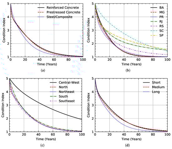 The Brazilian standards have different values related to the interval between inspections, but they all consider the periodicity constant, not giving consideration to the bridges’ singularities. As discussed throughout this article, bridges in a network are likely to share similar environmental conditions but, depending on their age, location, structural typology, and other aspects, they may be exposed to different structural deterioration process over time. Hence, forecasting simulations were carried out to identify the bridge behavior for different scenarios.