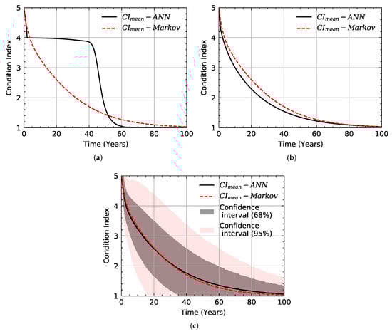 Another approach to predicting performance over the years is to obtain the transition probability matrix for one year and evaluate the performance over the years, similar to the Markov model. Figure 13b presents the results for this approach. It is possible to observe that the ANN model yields higher deterioration results. However, it is tricky to consider only one year between inspections when working with the ANN model as it was trained with a time distribution of up to 10 years (Figure 9).