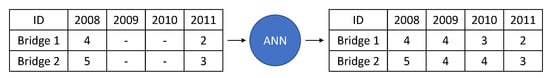 Even though these approaches could solve the problem, they do not consider the stochastic behavior of the deterioration process. Thus, predictive models such as Markov and ANN would be a better option to fill in the gaps reliably. For the context of this work, and considering the results obtained in Table 5, the approach selected is the one proposed by [], where the authors used an ANN model to generate artificial historical bridge condition indexes. The example already discussed was used to exemplify the application of the selected methodology, as illustrated in Figure 14.