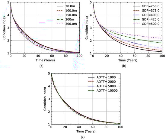 Expected condition over time. (a) Bridge length; (b) GDP in USD billion for 2018; (c) ADTT.
