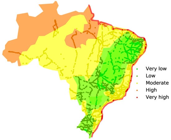 The knowledge of the degree of atmospheric aggressiveness is vital in building maintenance management to ensure the project’s useful life []. Humidity and high temperatures notably favor the degradation processes of materials exposed to the atmosphere. Wetting time, type and concentration of gaseous pollutants and particulate matter in the atmosphere determine the magnitude of the attack. The availability of values for these variables greatly assists in assessing the potential risk of corrosion. Figure 16 illustrates a modified Brooks atmospheric corrosivity index for the Brazilian region.