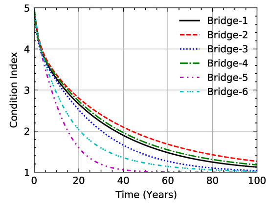 As bridges in a network are likely to share comparable environmental conditions, it would be plausible to presume that the deterioration processes should be similar in equivalent scenarios if considering load and environment. Hence, in the first part of the analysis, the bridges were assumed to have the same deterioration processes regardless of structure type, location, and material of the superstructure.