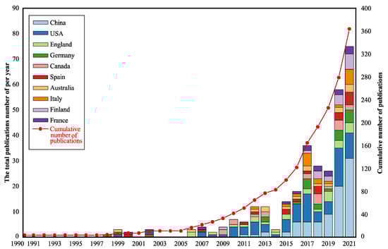 The annual distribution of CPCN in the building sector reflects the development speed and knowledge accumulation status of this field [63]. According to the data in Set #10 retrieved from the “Web of Science Core Collection”, and as shown in Figure 1, the annual publication volume has increased year-by-year. Initially, steady growth began in 2005 through publications from England and Australia. Publications began to increase rapidly in 2015, indicating that the Paris Agreement for energy saving and emission reduction policies in various countries around the world had a significant impact and caused experts and scholars in various countries to conduct research in the field of CPCN in buildings [66,67,68]. In 2020, the growth rate of literature publishing accelerated significantly in line with the occurrence of the 2020 Climate Ambition Summit initiated by the United Nations and relevant countries to commemorate the fifth anniversary of the Paris Agreement. It is clear that the 2020 Climate Ambition Summit further mobilized the international community to strengthen climate action and advance the multilateral process [69].