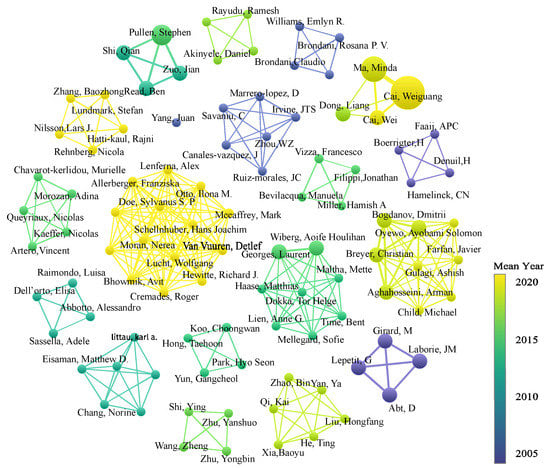 VOSviewer software was used to carry out overlay visual mapping for the TLS of the top 100 authors. In Figure 2, the node size represents the number of co-authored articles. The links between nodes represent collaboration, and a larger link width indicates closer collaboration between authors [63]. In Figure 2, we can see the contribution and cooperation degrees of experts more intuitively than in Table 2. Different nodes come together to form a cluster, with frequent cooperation within a cluster but less cooperation between clusters.